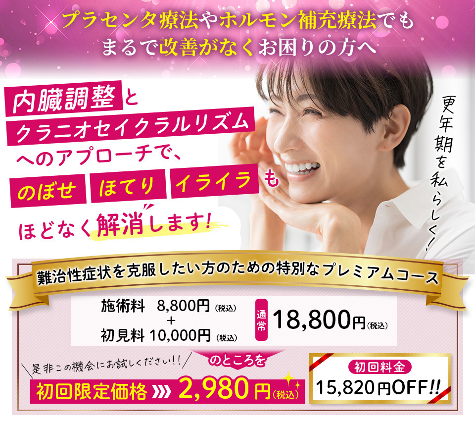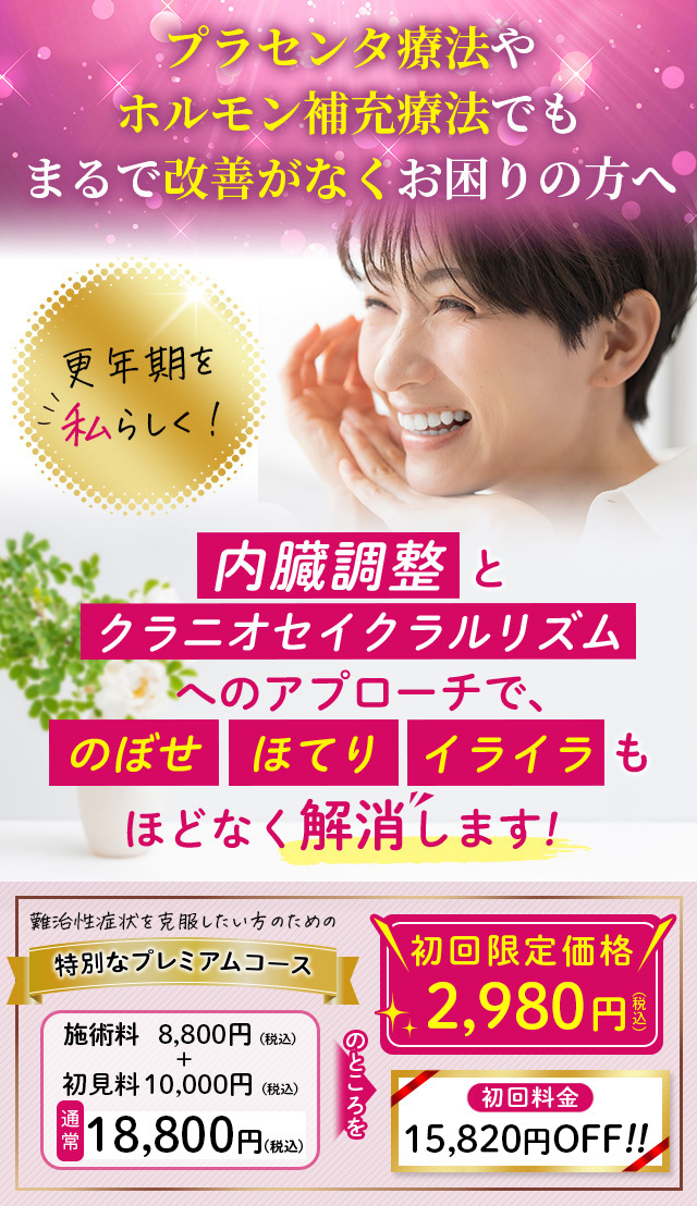 当院の更年期障害療法はホルモン剤のように薬を使うわけではないのでリスクはありません。また、副作用もありません。