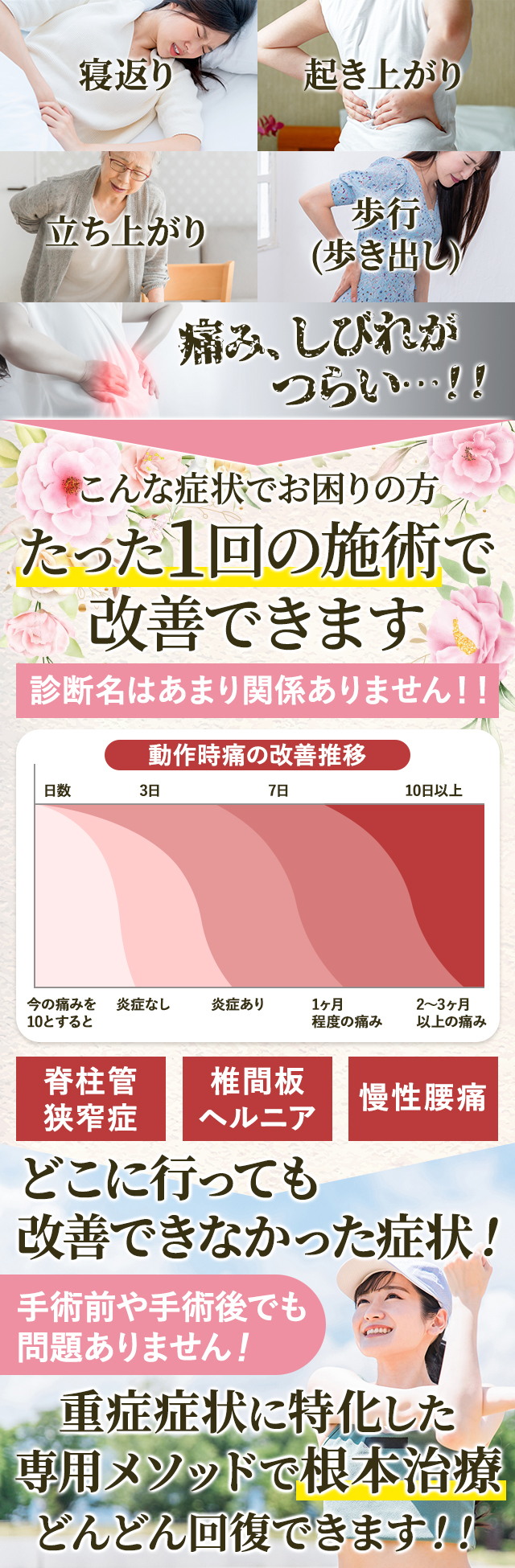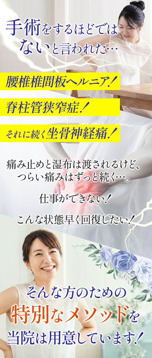 腰椎椎間板ヘルニア、脊柱管狭窄症、慢性腰痛、ぎっくり腰、etc…。何年も長期的に慢性化した腰痛であっても改善する道が開かれるのです。